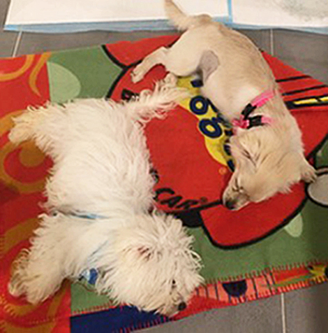 Eden is the sweetest girl, loves belly rubs, kisses and her and Fletch follow each other everywhere. He waits for her to drink the water first, and she waits for him at the door when they come back inside from potty.